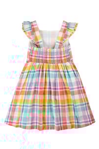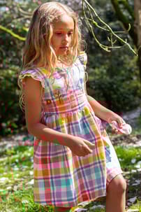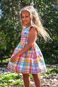 The Hyacinth Dress is pure summer magic with ruffled sleeves, a smocked back, and playful gathers at the waist. Itβs crafted from soft and lightweight organic cotton and has adjustable straps to ensure a fit that lasts longer, so twirls and adventures can continue all season!