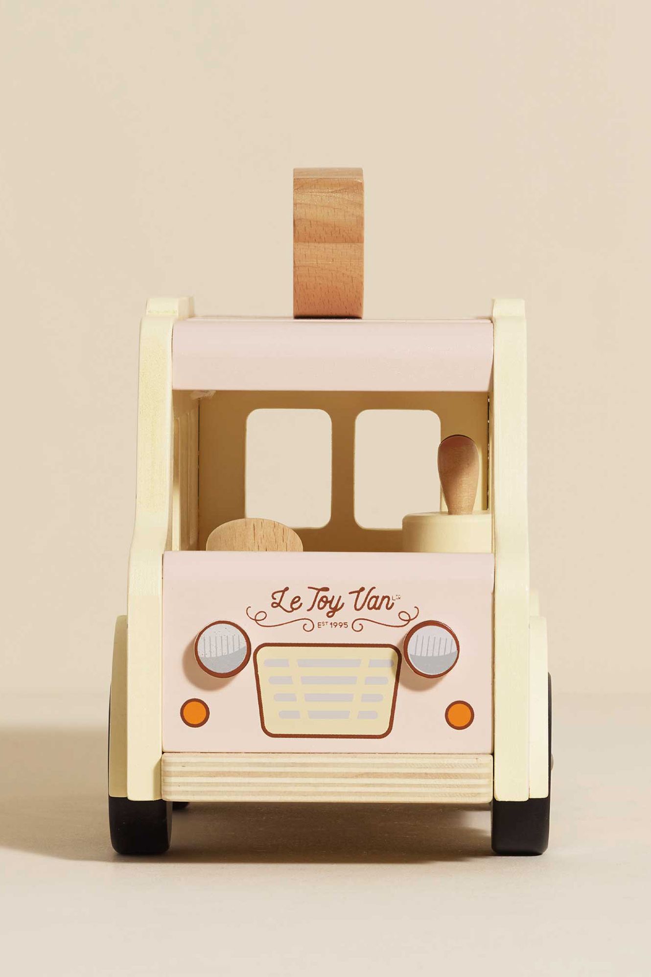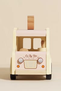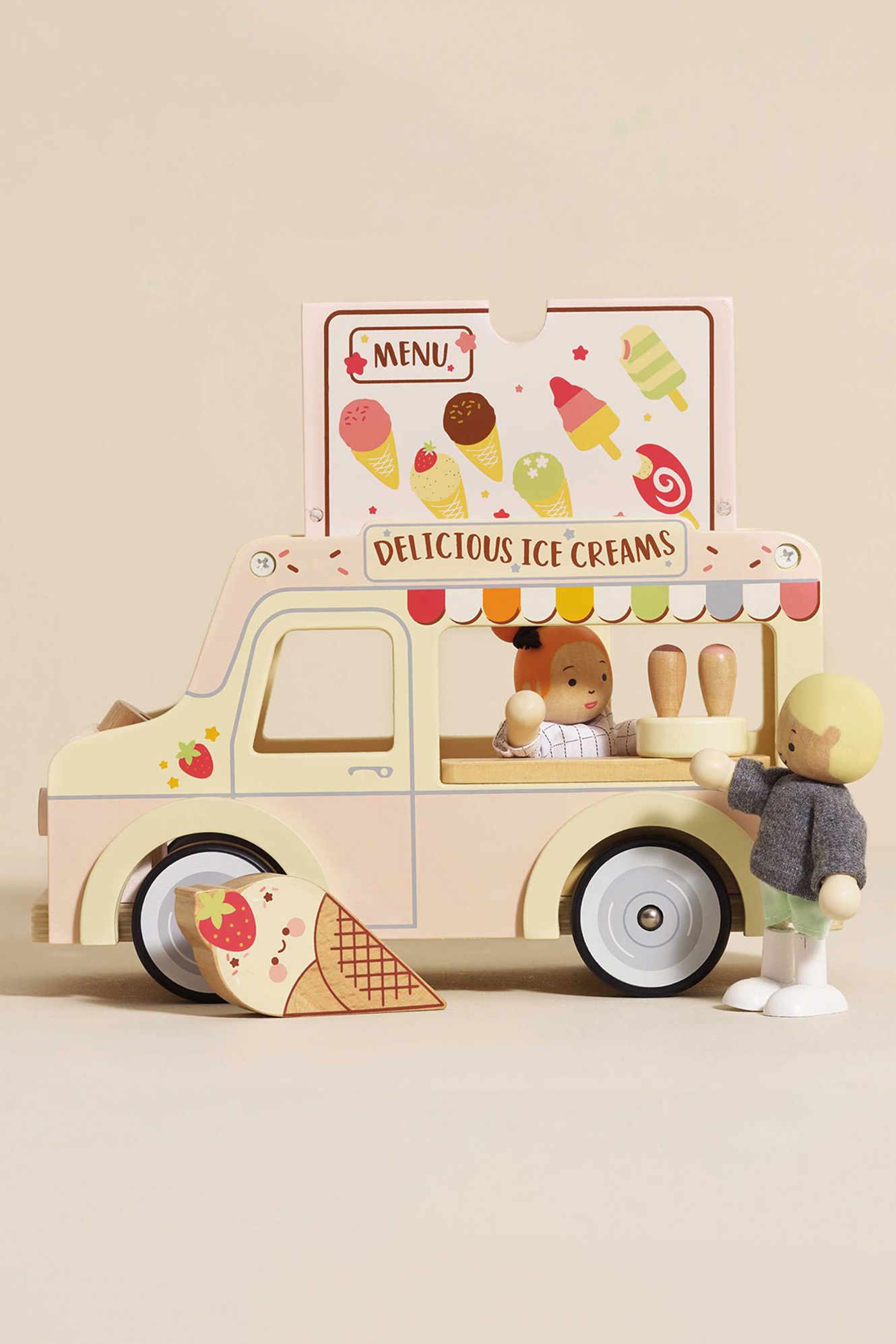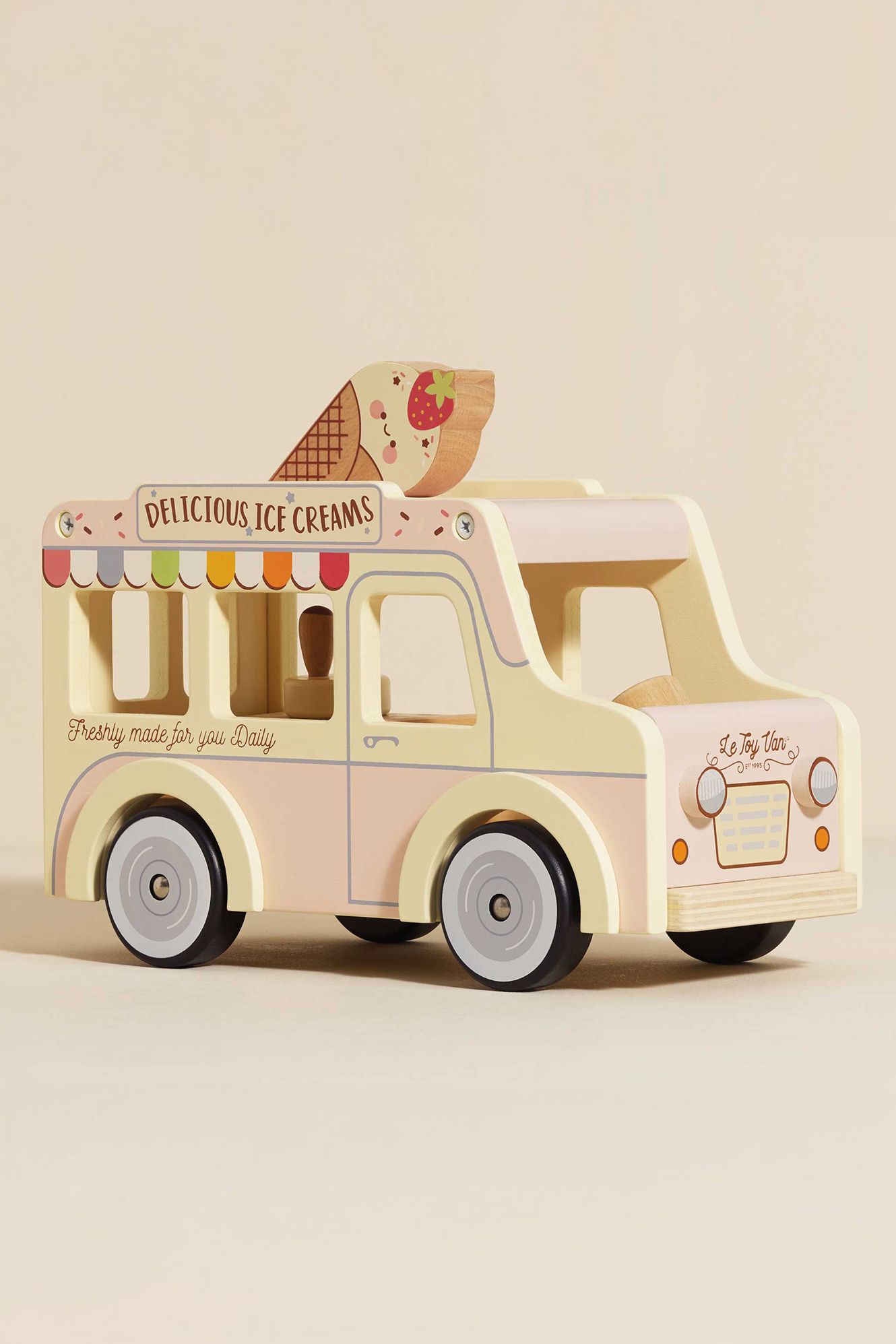 Playtime doesn't get much sweeter than this miniature, doll sized ice-cream van. Painted in soft pink, grey and cream hues, this retro style toy is made from FSC™ - certified wood and packed with interactive features including a flip up roof, pretend freezer, serving window and mini sized ice cream cones and treats, made to inspire day after day role play fun.