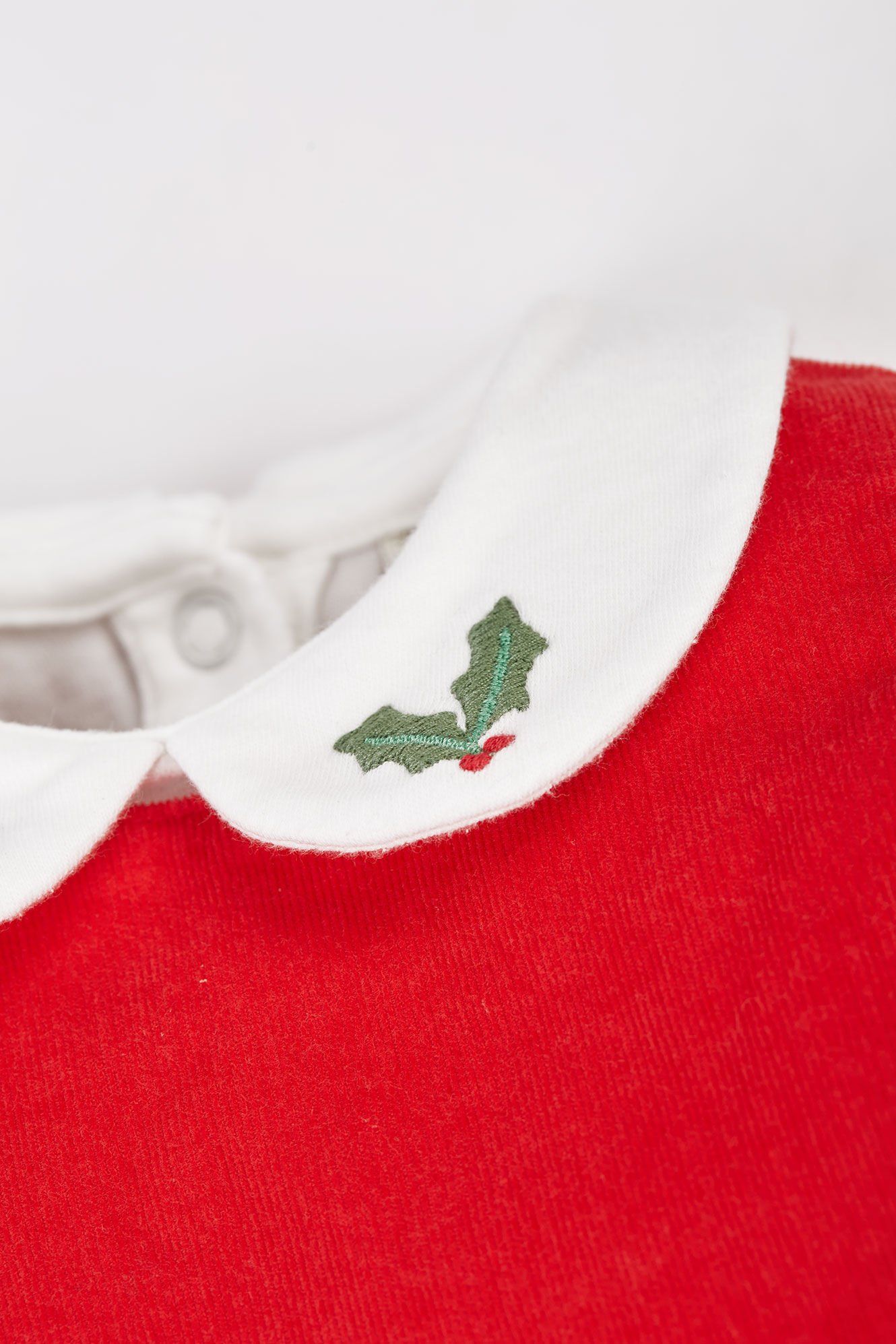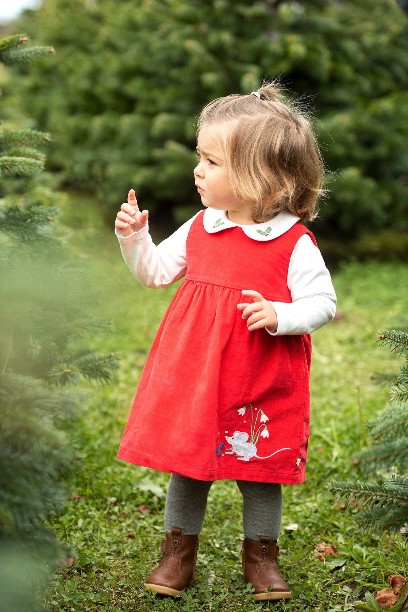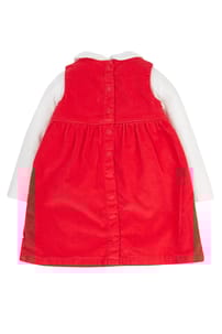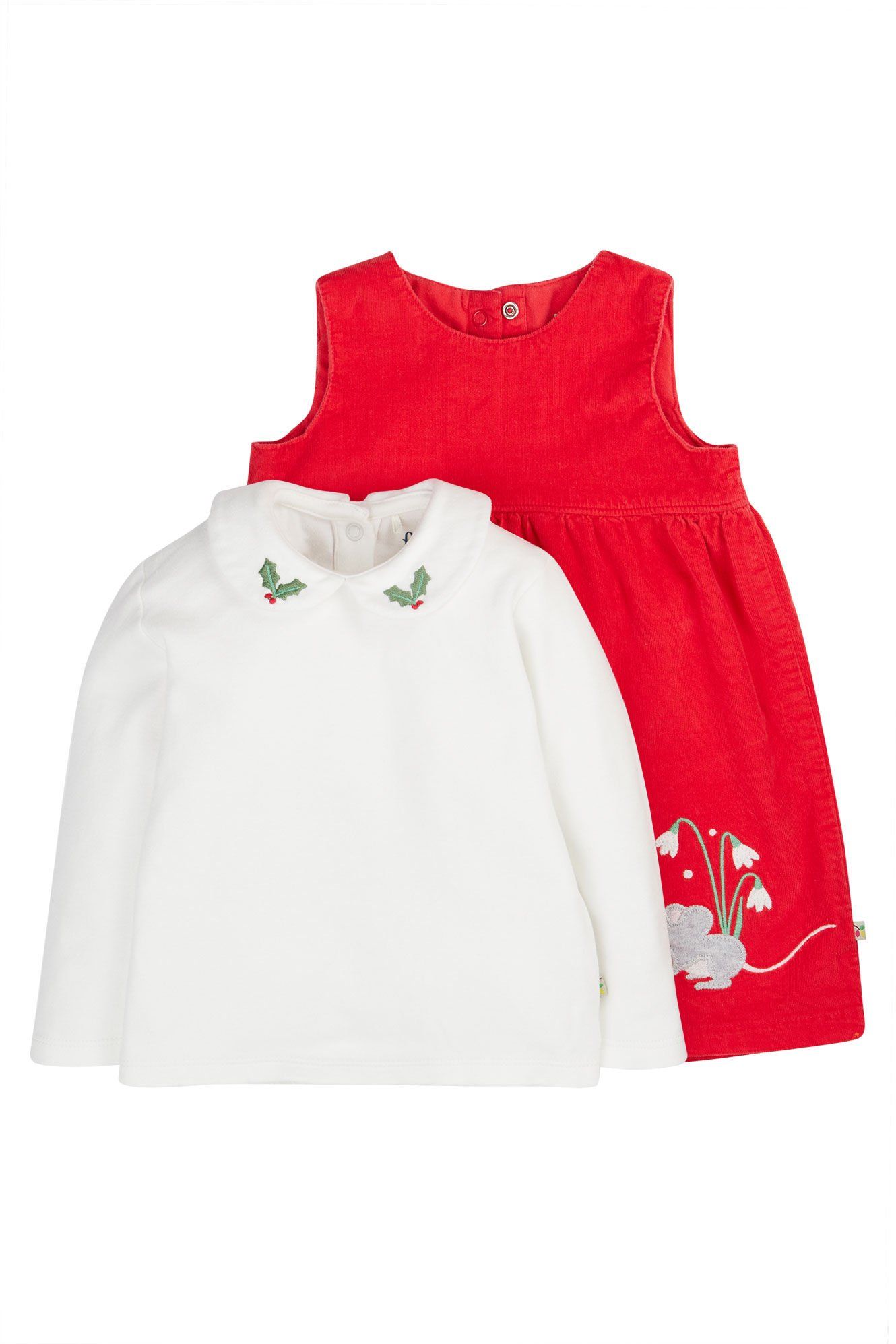 Get their Christmas outfit sorted with our brand-new, 2-piece Macie Outfit - perfect for wintertime adventures. We've crafted the sleeveless dress from a beautiful blend of soft organic cotton cord and a touch of stretchy elastane to create a fab texture that pings back to shape, playtime after playtime. To complete the set, we've made the long-sleeved top from 100% super-soft organic cotton, ensuring that it is wonderfully cosy and gentle against delicate skin. And the Peter Pan collar, with holly leaf embroidery details, adds a traditional look when layered over the bright True Red of the pinafore dress. Plus, the full popper fastenings on the back make dressing wriggly little ones a breeze. Great for pairing with our coordinating Norah Tights, and don't forget to pop on our Kenna Fairisle Cardi on chilly days.