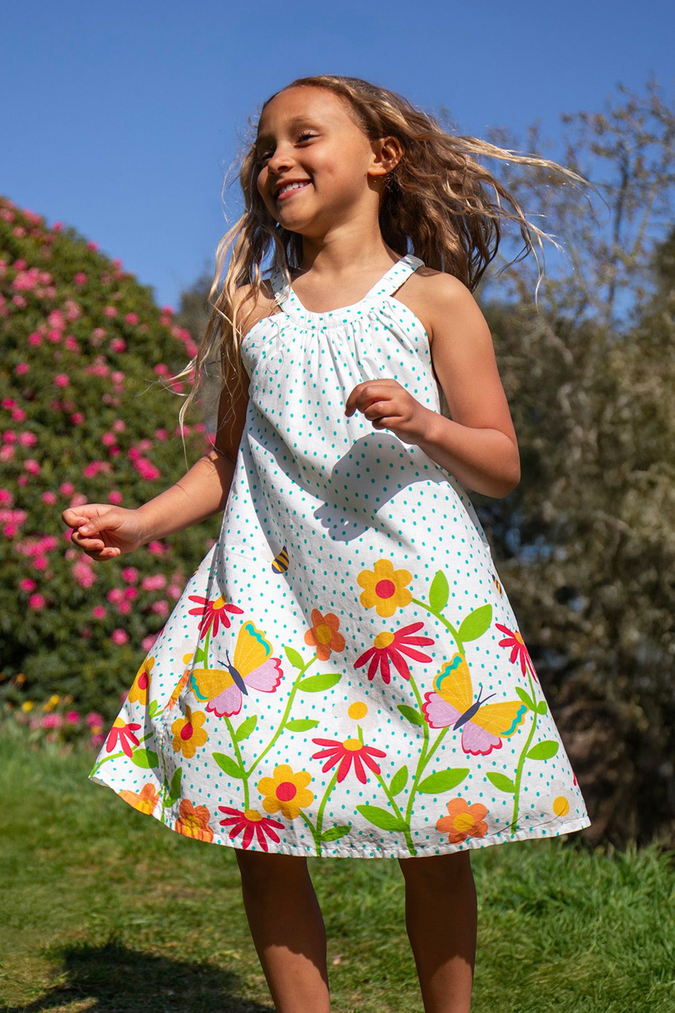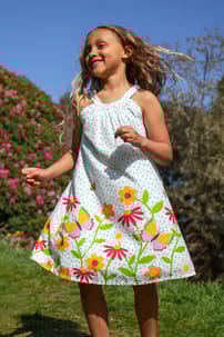Meet the Myra Twirly Dress - a floaty trapeze-style dress designed for endless twirls and summertime fun! Fully lined and featuring an elasticated neckband for easy dressing, this dress is crafted from organic cotton, making it perfect for spinning, playing, and soaking up sunny adventures.
