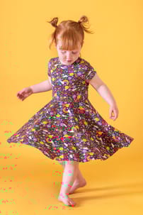 Always ready for a twirl! Our Spring Skater Dress is perfect for spinning, dancing, and twirling the day away. With short rolled cuff sleeves, a full circular skirt, and a comfy organic cotton elastane fabric, it’s soft, breathable, and ready to party!